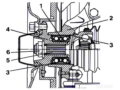 In the diagram : ① Gen1 wheel bearing, ② Flange plate seat hole, ③Retaining ring, ④ Wheel hub shaft, ⑤ Shaft or splined shaft, ⑥Lock nut
